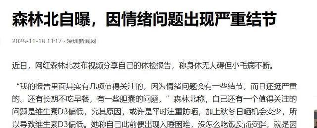 森林北究竟得了什么病? 这事又 和汪峰有什么关系? 高情商的代价 这份报告本身,并没有惊天动地的大病,反而是一堆让人感同身受的 “小毛病” —— 体内结节比普通人严重、 因不吃早餐引发的 胆囊问题、 以及常见的 维生素缺乏。 然而,医生的诊断和森林北的自述,却为这些冰冷的医学术语注入了 惊人的叙事张力, 医生指出,许多问题源于 “长期情绪压抑”, 而森林北自己也坦陈,面对问题时,她 “选择了隐忍”。
